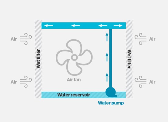 要冷却数据中心,一个小功率的泵或重力给料系统持续不断地向一组具备巨大蒸发面积的纤维帘上喷水雾。一个小功率的风扇配合风道迫使空气通过这些湿帘。空气流穿过湿帘的过程中,部分水被蒸发,结果导致空气流出一侧的空气温度会比入口侧冷得多。(见图1)。